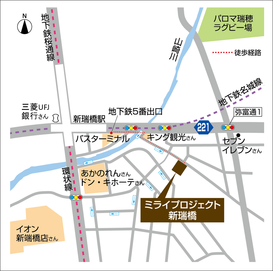 地下鉄5番出口を出てキング観光さん方面に歩き、橋を渡ったら右の歩道へ曲がり、道なりに歩くとミライプロジェクト新瑞橋正面玄関に到着します。駅の5番出口から徒歩でおおよそ5分です。