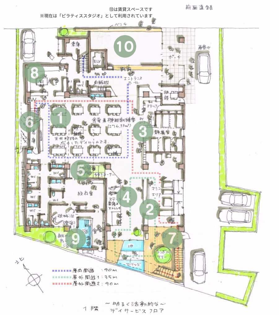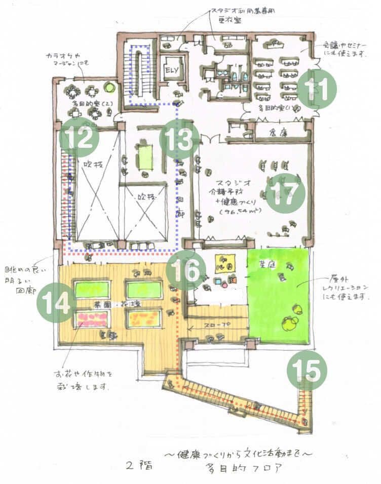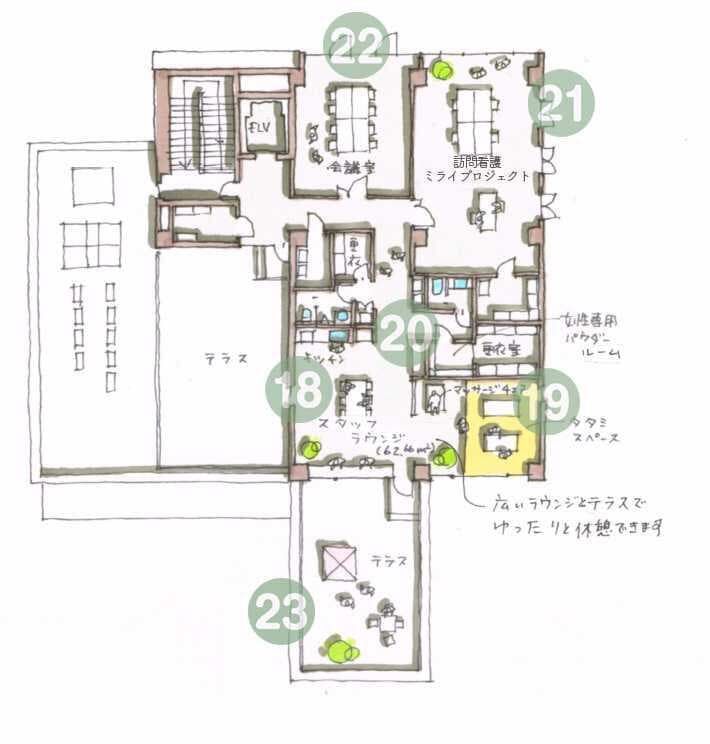 一階 番号クリックで拡大写真が開きます 1・食堂2・機能訓練コーナー3・静養室 4・リラクゼーションスペース5・畳コーナー6・室内階段 7・テラス8・オープンキッチン9・浴室10・ピラティススタジオ 二階 番号クリックで拡大写真が開きます 11・多目的室112・多目的室2 13・回廊14・バルコニー(菜園)15・屋外階段 16・KIDS ROOM17・運動スタジオ 三階 番号クリックで拡大写真が開きます 18・スタッフラウンジ19・畳スペース 20・パウダールーム・更衣室21・訪問看護ミライプロジェクト 22・会議室23・屋上テラス