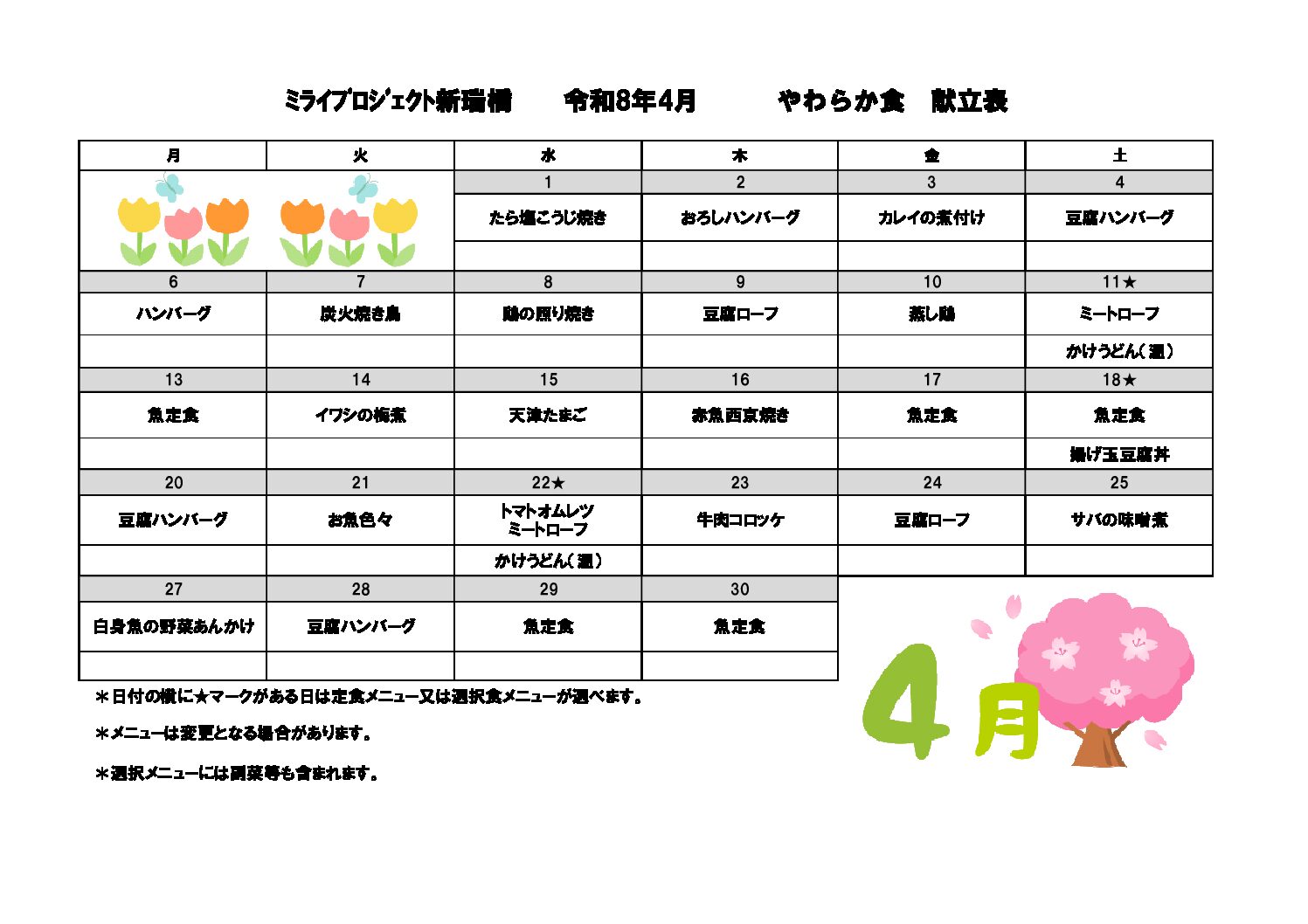 2026年4月献立(軟主菜食)のご案内